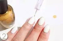 Step 3:然后在指甲的正中間橫向用金黃色珠光甲油點上稍大于周圍的波點,波點分兩行,中間空出一定的空隙,兩行波點錯位排列。