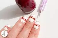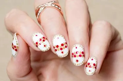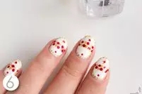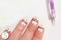 Step 4:然后用點鉆筆沾取紅色甲油點在金黃色波點的間隙,波點的大小與金黃色波點一致。在靠近指甲根部的位置點上紅色的波點。