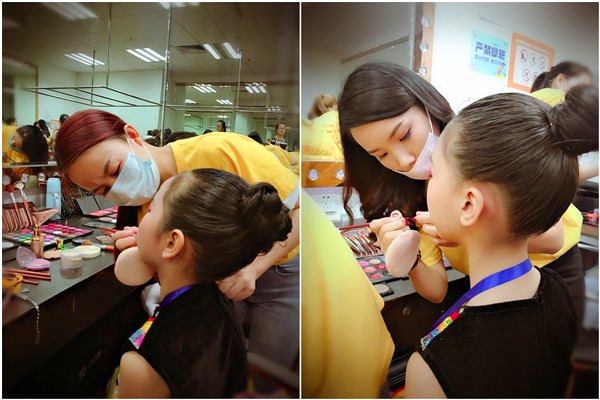 時代化妝班經(jīng)歷多次國際重大賽事考驗,面對如潮水般的觀眾,眼里只有一件事,那就是完成讓自己的化妝技巧完整的展現(xiàn),讓每一個參賽小朋友更有魅力。心態(tài)早已不會阻礙她們對技巧的追求,比如跟妝模特這一塊,時代化妝組學員采用當前更新跟妝法,依照小朋友的面部結構,結合黃金分割法則,為參演小朋友勾勒出更適合臉型的彩妝。