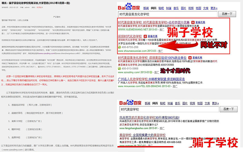1、早前因同行竊用“時代學校、時代化妝學校、時代美容學校”等名義進行招生,冒用時代品牌,我校兩次揭露該惡劣行徑:
